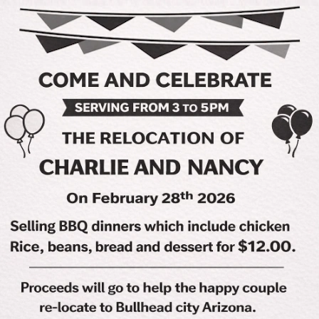 Join us on Saturday, February 28, 2026, as we come together to celebrate Charlie and Nancy and support them in their upcoming relocation to Bullhead City, Arizona.